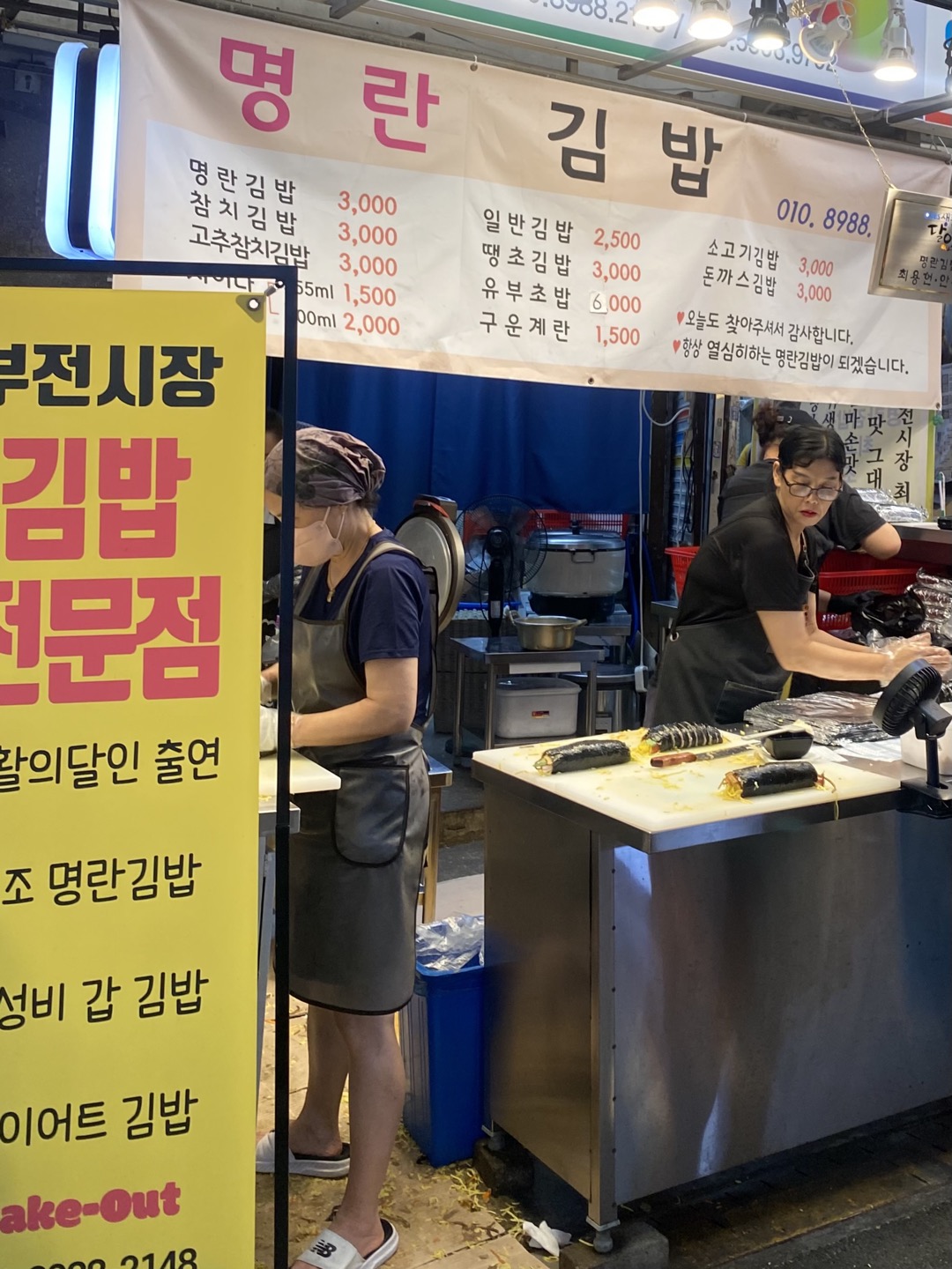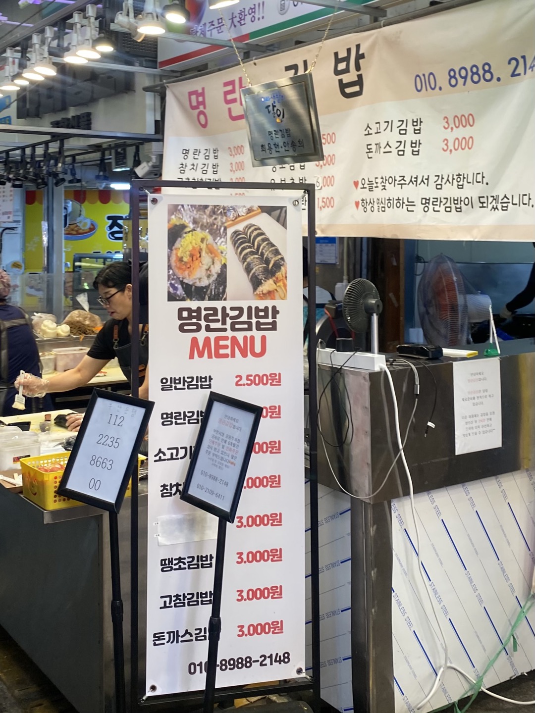 평소에 김밥도 좋아하고, 명란도 좋아하는 저에게 단연 흥미로울 수밖에 없는 곳이었어요. 요즘 분식집에 가면 기본 김밥이 거의 3,000원부터 하는 곳도 많고 거기에 다른 재료들이 추가가 되면 +500, +1,000원 이상 붙게 되면서 김밥 한 줄 가격이 이렇게 올랐냐며 새삼 물가를 실감하곤 하는데요.. 부전시장 안 명란 김밥 집은 일반 김밥이 2,500원 나머지는 모두 3,000원이더라구요. 일단 먹어보기도 전에 가격 보고 우와.. 했던 기억이 나네요.