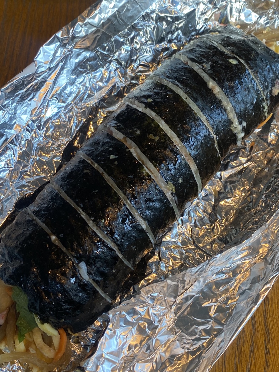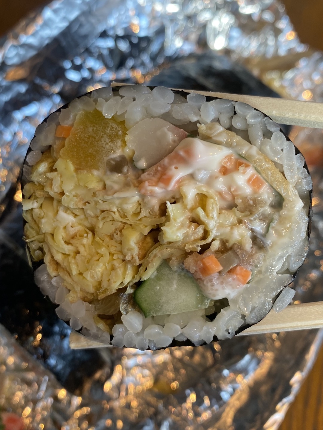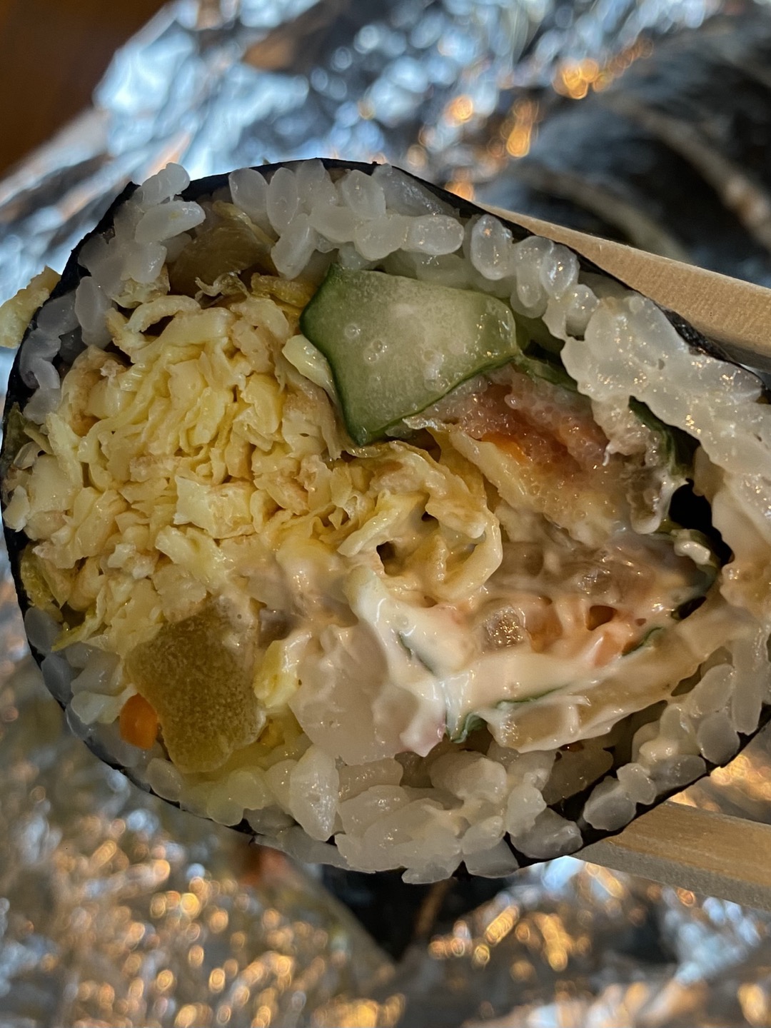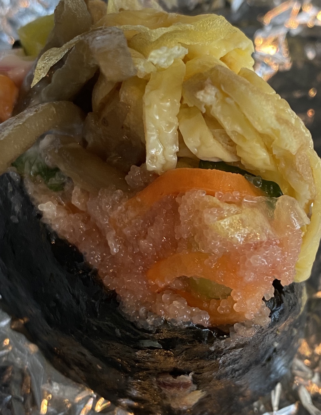 개인적으로 밥 양이 적었던 게 너무 좋았어요. 채 썬 계란이 가득 들어가 있었고 여러 가지 김밥 재료들이 명란의 짭조롬함과 간이 딱 맞게 잘 어우러졌어요.